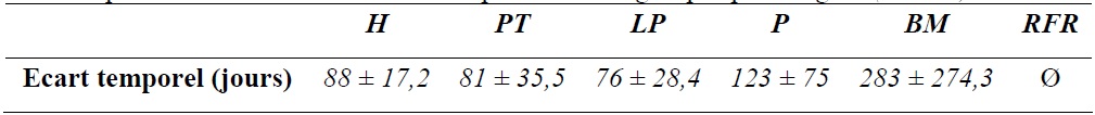 Tableau 15. Ecart temporel constaté entre les dates d’hospitalisation ou date de survenue du handicap et les dates des tests de marche pour les sous groupes pathologies. (M ± SD)
