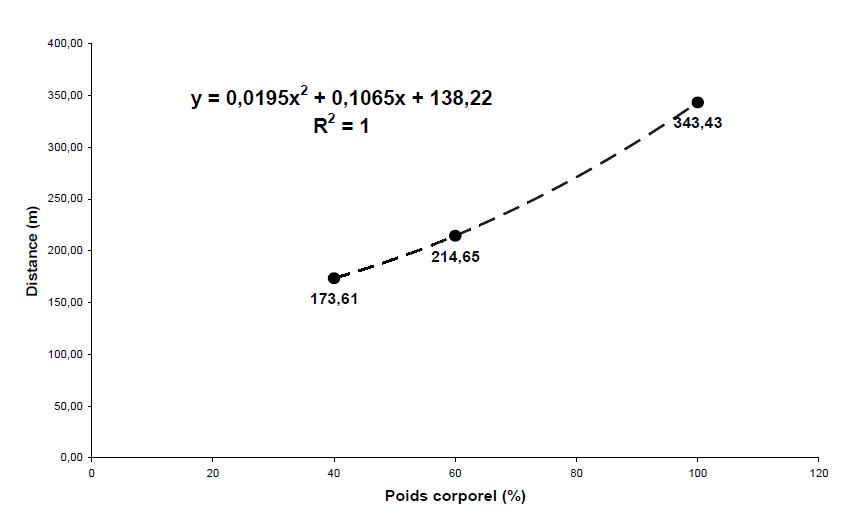 Connaissant les valeurs de distance au sec (100% de remise en charge), en immersion à l’ombilic (60% de remise en charge) et en immersion au niveau de l’appendice xiphoïde (40% de remise en charge), j’ai pu placer ces trois points sur le graphique et tracé une courbe polynomiale et trouver son équation du second degré. L’équation qui régie les performances lors du test de marche chez le sujet sain est : Y = 0,0195X2 + 0,1065X + 138,22. X correspond à la mise en charge du poids du corps et Y, la distance parcourue. De ce fait, nous avons la possibilité de calculer la distance moyenne qu’un sujet sain peut réaliser en moyenne lors de ce test de marche pendant 6 minutes, pour différentes valeurs de % de masse corporelle ressenti en immersion.
