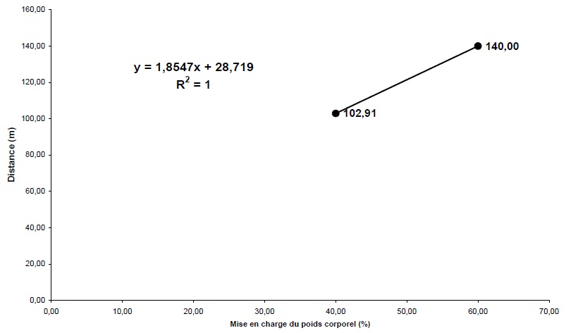 Le graphique du groupe pathologique ne possède que deux points, ce qui me donne une relation linéaire Y = 1,8547X + 28,719. X correspond à la mise en charge du poids du corps et Y, la distance parcourue.