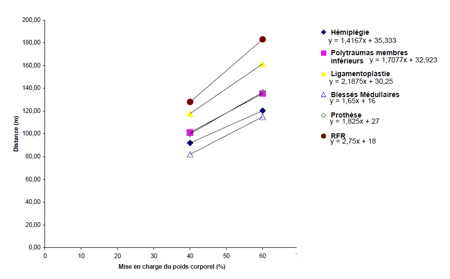 Figure 16.3 Modélisation de la performance du test de marche en fonction de la mise en charge corporelle et de la distance parcourue chez les sous groupes de pathologies.