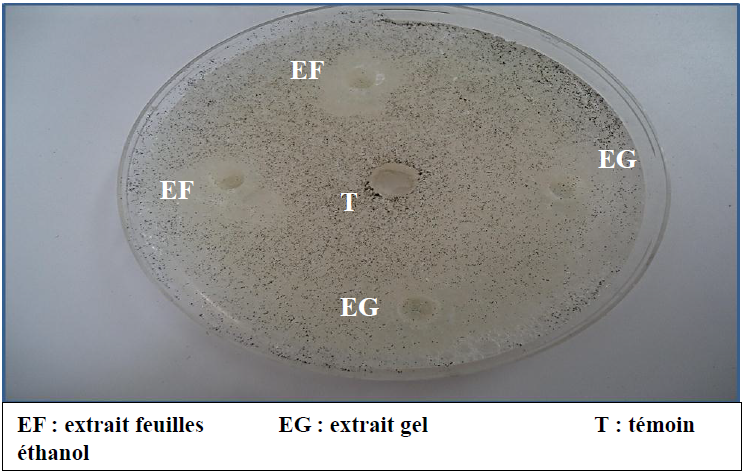Cette sensibilité se traduit par l’apparition des zones d’inhibition importante qui entourent les disques (17,3 ± 0,12 mm pour la feuille et 16 ± 0,081 mm pour le gel).