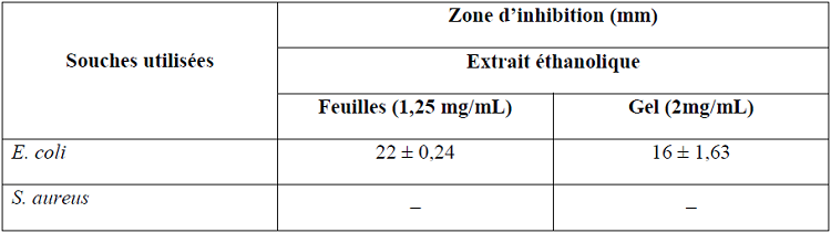Escherichia coli montre une sensibilité vis-à-vis de l’extrait éthanolique de la feuille (1,25mg/mL) supérieure à celle de l’extrait gel (2 mg/ mL). Celle-ci se traduit par l’apparition des zones d’inhibition importantes qui entourent les disques imprégnés par l’extrait de la feuille (22 ± 0,24 mm) que du gel (16 ±1,63 mm). L’éthanol ne montre aucune activité antibactérienne en raison de l’absence complète d’une zone d’inhibition au tour des disques témoins.