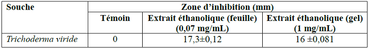Tableau 14 : Zone d’inhibition (mm) des extraits de la feuille et du gel d’Aloe arborescens sur Trichoderma viride