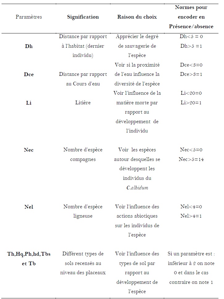 Tableau IV: Paramètres d’habitats encodés