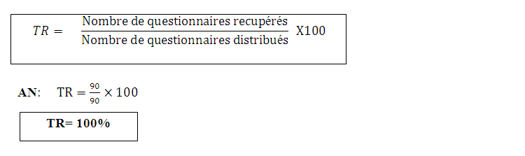 Apres vérification nous nous sommes retrouvés avec quatre-vingt-dix (90) questionnaires récupérés. Le taux de récupération en matière de recherche se calcul selon la formule suivante :