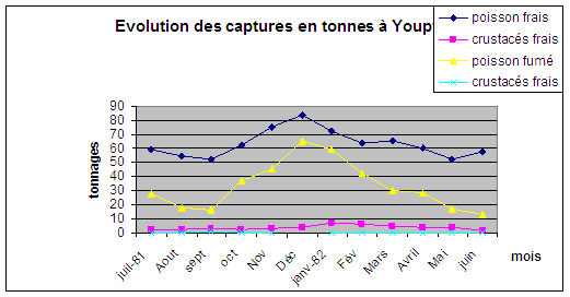 La pêche artisanale à Youpwe est fortement influencée par les saisons de la l’année. Ainsi les périodes de fortes captures se situent entre Octobre et Avril. Cette période correspond à la saison sèche dans le littoral camerounais. Par contre, les périodes de faibles prises concernent la saison pluvieuse qui, elle va de Mai à Novembre. Le tableau ci – dessus donne une indication de l’évolution des captures en tonnes ainsi que la nature des captures.