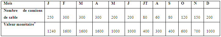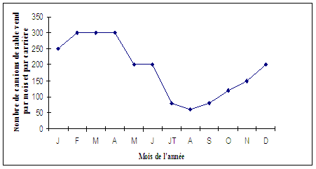 Les périodes de grande vente du sable se situent pendant la saison sèche, période pendant laquelle les travaux de construction sont à leurs plus hauts points à Douala (voir Fig.3 P. 70). Pendant cette période précisément, les ventes de sable passent de 2 à 5 camions pour se stabiliser à 10 camions par carrière et par jour. Soit une valeur monétaire chiffrée de 200 000 FCFA.