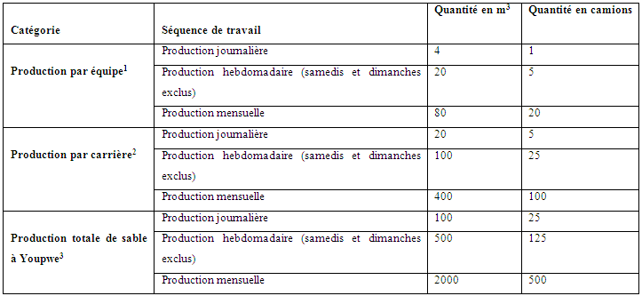 Au total la production mensuelle de sable pour l’ensemble des équipes et des carrières de Youpwe est égale à 2 000 m3 par de sable par mois. (Voir tableau n°11)