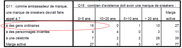 A une très fine majorité, 54% contre 46%, les répondants 0 à 5 ans d’existence considèrent que la marque la marque devrait opter pour l’utilisation d’un ambassadeur de marque. Alors que pour les marques de plus de 5 ans d’existence, les consommateurs considèrent que l’utilisation d’un ambassadeur de marque n’est pas utile. Les entreprises de moins de 5 ans pour une marque de sneakers seraient une exception pour l’utilisation d’un ambassadeur de marque.