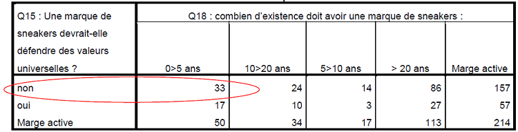 Il apparaît comme très clair qu’une marque de sneakers quelle que soit son nombre d’années d’existence ne doit pas défendre des valeurs universelles, à 66% pour une entreprise ayant moins de 5 ans d’existence, même si la moyenne générale est d’environ 75% qui sont contre.