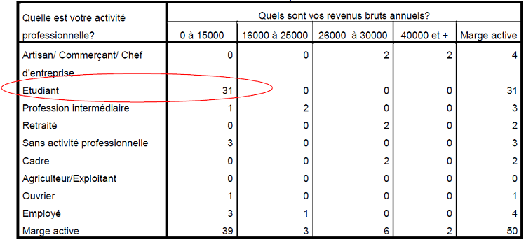 Sans surprise, comme je l’expliquai dans la méthodologie de recherche, ce sont les étudiants ayant un revenu de 0 à 15 000 euros qui ont répondu entre 0 et 5 ans à la question 18.