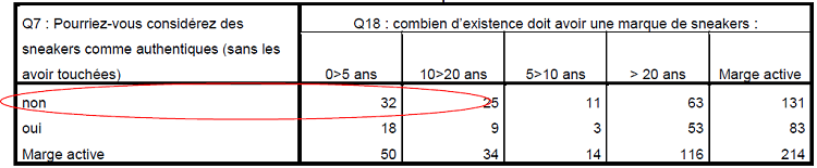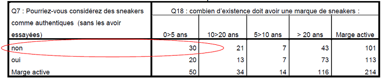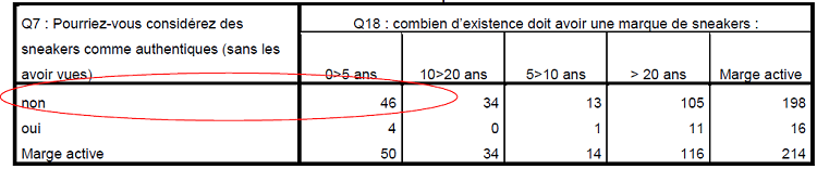 Ici, il est intéressant de constater que 60% des répondants 0 à 5 ans d’existence d’une marque ne considèrent pas des sneakers comme authentiques sans les avoir essayées alors qu’à l’inverse, 63% des répondants plus de 20 ans considèrent des sneakers comme authentiques sans les avoir essayées.