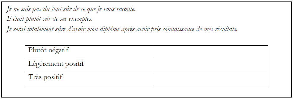 Une fois le tableau rempli avec les bonnes réponses, Pixi se rend compte que le centre de langues est en train de fermer. Il se déconnecte du dispositif et rentre chez lui. Pris par ses obligations professionnelles et personnelles, il retourne sur la plateforme trois jours plus tard et tombe directement sur l’étape suivante qui lui présente les moyens pour nuancer son opinion en ajoutant un adverbe. Un bref explicatif montre la tendance plus ou moins positive et certaine que l’on peut apporter à une expression, puis sur le même principe que le tableau précédent, il doit classer les phrases suivantes selon leur sens plutôt positif ou négatif :