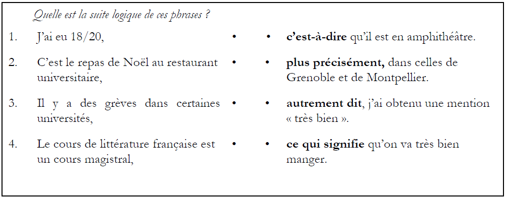 Enfin, pour renforcer le travail sur les transitions et les connecteurs logiques, Pixi écoute deux interviews radio de chercheurs qui expliquent leurs travaux et leurs résultats. Lors de l’écoute, il doit relever un maximum de connecteurs logiques du discours et les replacer dans un tableau qui explique la fonction de ces connecteurs logiques (pour introduire un premier argument, pour introduire un élément final, pour exprimer une concession, pour marquer une conséquence…).