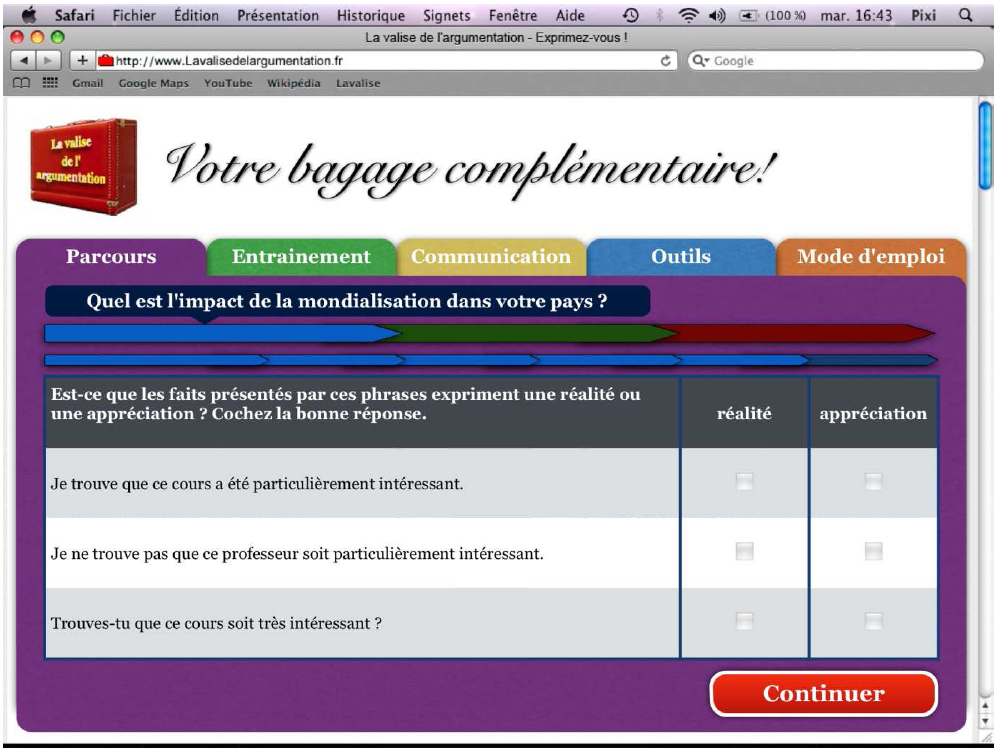 Une fois qu’ils sont connectés depuis chez eux par exemple sur la plateforme, et qu’ils ont cliqué sur « commencer le parcours », tous les nouveaux utilisateurs doivent préparer un exposé sur la même question : Quel est l’impact de la mondialisation dans votre pays ? Cette question, l’objectif de production langagière, sera toujours indiquée en haut de toutes les pages du dispositif par lesquelles passera l’utilisateur pour préparer la réalisation de son exposé oral afin qu’il n’oublie pas l’objectif final de toutes les micro-tâches. Suivons le parcours et la progression de Pixi afin d’exposer la suite des six micro-tâches qu’il aura à effectuer avant de présenter son exposé oral en groupe avec le tuteur dans deux semaines, ce qui représente entre huit et dix heures de préparation avec au minimum cinq heures d’utilisation de la plateforme et trois heures en présentiel en tutorat.