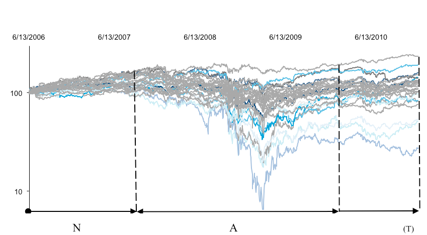 – Pour des raisons de programmation en Visual Basic, nous avons préféré laisser un espace-temps de 10 séances boursières entre la période de temps dite normale et celle de la crise des Subprimes. Ce laps de temps fut fixé de façon arbitraire.