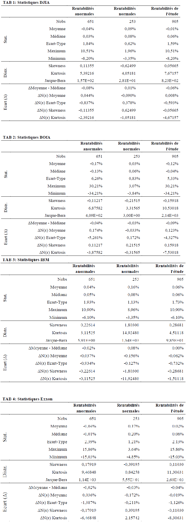 Le DJIA est calculé en fonction de la moyenne des fluctuations des 30 titres le composant. Il peut être un bon indicateur de moyenne pour l’ensemble du marché. Cependant, ces variations sont par définition lissées en fonction des différentes sensibilités des titres concernés. Bank Of America, IBM et Exxon ont été choisis d’une part, par leur importance en terme de capitalisation et d’autre part, par leurs différences sectorielles les unes des autres. Nous avons donc un échantillon restreint, mais représentatif du marché américain. Les tableaux ci-dessous permettent de résumer les principaux états statistiques des différents titres :