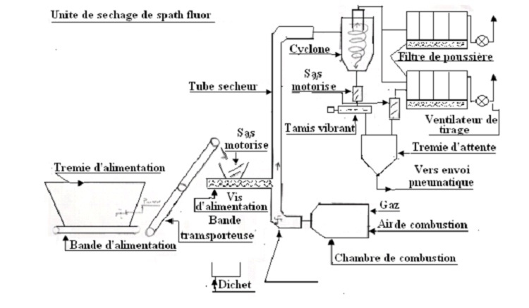 • Le troisième bloc assure le séchage de spath de fluor, cette fonction est faite par différents éléments comme la chambre de combustion, le tube sécheur et le désintégrateur.