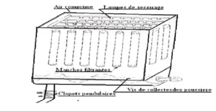 Il récupère les poussières pour diminuer le maximum de perte du spath sec. Un système d’envoi pneumatique permet l’envoi du produit sec vers le silo de stockage. Le principe de fonctionnement du transport commence par l’ouverture de double Caplet qui actionne l’ouverture de la vanne pneumatique, dite aussi vanne à casque. Par la suite, le produit commence à chuter de la trémie d’attente vers le centenaire, lorsque le produit atteint le détecteur de niveau, ce dernier actionne la fermeture de la vanne à casque et double Caplet. Ensuite, la vanne d’admission d’air s’ouvre et l’envoi se déclenche avec une pression d’envoi égal à 1, 8 bar. Lorsque le centenaire se vide de produit la pression chute à 0,4 bar et la vanne d’admission d’air se ferme et cycle se recommence. La figure n°3 présente le filtre de poussière.
