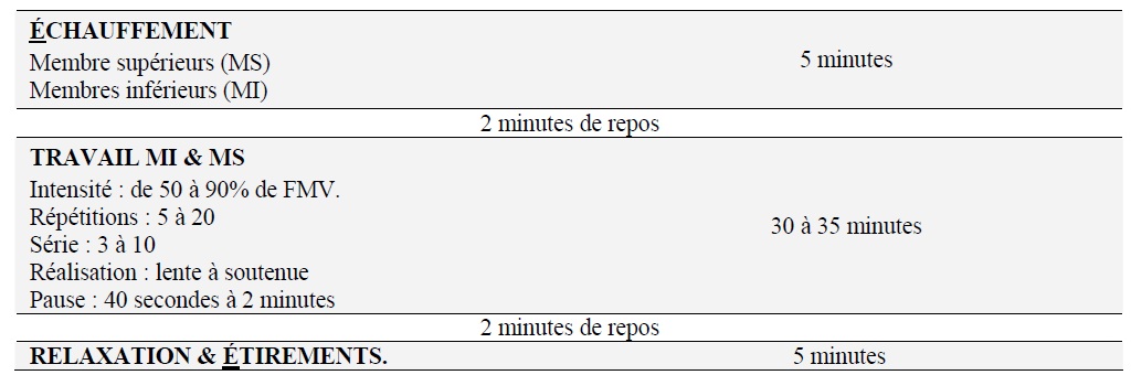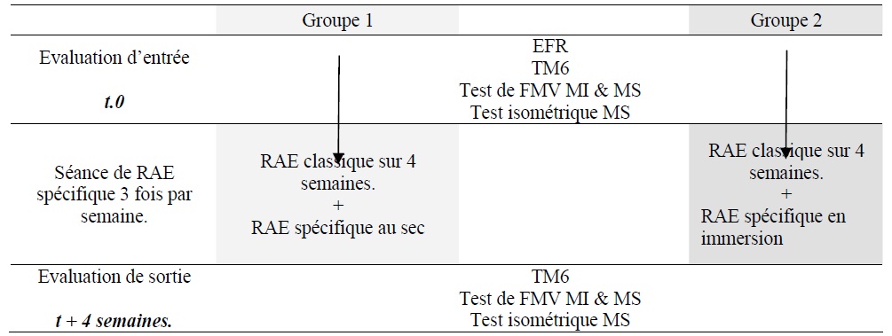 Les patients volontaires pour l’étude vont donc participer à des sessions de RAE supplémentaires au sec ou en immersion via le bassin de balnéothérapie. A leur période de RAE classique s’ajoute par conséquent 12 sessions de RAE spécifique de 45 minutes. Ces séances de réentrainement spécifique sont réalisés avec le matériel Thera-band® Afin de permettre une comparaison la plus stricte possible, les séances au sec et en immersion suivaient le même programme. Celui-ci est schématisé via le tableau 1.