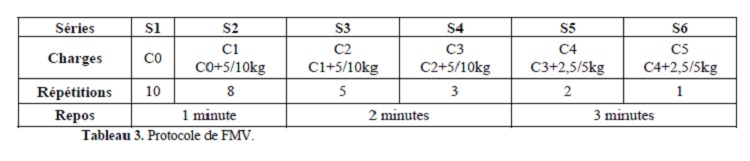 Chaque patient passe un test de FMV au niveau des membres inférieurs (MI) via la chaise à quadriceps et au niveau des membres supérieurs (MS) avec les tubes élastiques.