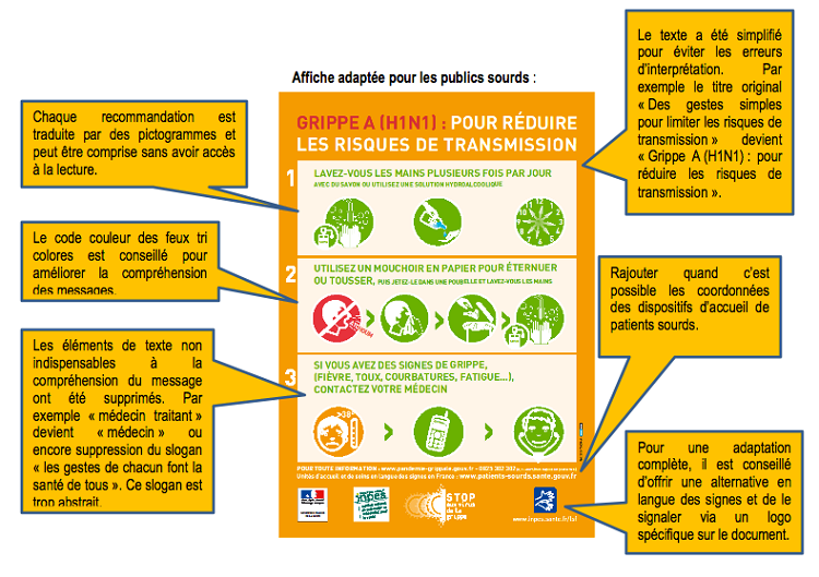 Il en va de même pour les affiches concernant les expositions dans les musées : elles peuvent être adaptées de manière à être plus compréhensibles pour les personnes sourdes. A ce propos, la Caisse Nationale de Solidarité pour l’Autonomie (CNSA) a mené une étude sur les éléments à adapter dont voici un exemple :
