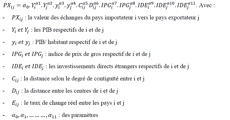 Les modèles de gravité en économie sont inspirés des principes de gravité en économie spatiale appliqués pour l’étude des aires d’influence des économies modernes. En économie internationale, les modèles de gravité ont été introduits pour analyser les flux d’échange bilatéraux entre pays. On considère que les flux d’échanges sont une fonction linéaire de la puissance économique des pays, la richesse et la proximité géographique. Elle peut être exprimée de la façon suivante : nij = f(Yi,Yj,Eij). Avec nij : les flux des échanges entre les pays i et j ; Yi et Yj : les PIB respectifs des pays i et j ; Eij : un vecteur de facteurs de résistance des échanges entre les deux pays comme la distance (proxy des coûts de transport), les conflits. Par exemple, la population, l’existence de facteurs historiques et culturels constituent des facteurs d’attraction tandis que les couts de transport, les barrières tarifaires et non tarifaires sont des facteurs de résistance.