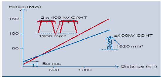 Figure 3.15 : Les liaisons CCHT perdent moins d’énergie sur la distance que leurs homologues CAHT.