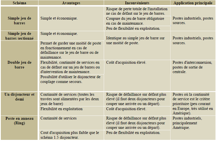 Les postes source HTB/HTA sont parfois alimentés en antenne mais, le plus souvent, ils sont alimentés avec un jeu de barre recevant plusieurs arrivées (ou lignes) HTB. Un ou plusieurs transformateurs HTB/HTA sont raccordés sur ces jeux de barre HTB simples ou multiples. A l’aval de ces transformateurs, des départs moyens tension partent d’un ou plusieurs jeux de barres HTA. Le tab 3.8 ci-dessous présente les differentes avantages, inconvenients et mode d’untilisation de réseaux.