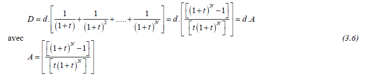 – l’expression du coût d’exploitation (D) sur la durée de vie de l’ouvrage (N), actualisé à l’année initiale d’établissement est (en considérant que le coût d’exploitation annuel (d) est payé en fin d’année tout au long de la durée de vie N de l’ouvrage) :