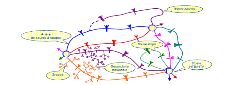 – Réseaux en coupure d’artère : tous les postes HTA/BT sont branchés en dérivation sur une boucle ouverte en un point proche de son milieu. En cas de défaut sur une partie de la boucle, il est possible d’alimenter tous les postes en ouvrant la boucle à l’endroit du défaut.