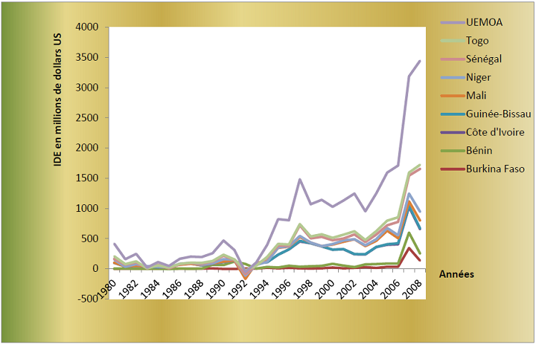 Pendant la décennie 1980-1990, les entrées d’IDE dans l’espace UEMOA ont enregistré une tendance à la baisse régulière en dents de scie jusqu’en 1985 puis une hausse de courte durée surtout au début des années 1990. Cet afflux massif sera vite interrompu par des sorties importantes prenant même des valeurs négatives en 1992. Ce phénomène traduit une fuite des capitaux privés de l’Union et une situation économique morose dans un climat d’ajustement structurel (Kinda, 2006). En effet, les sorties les plus importantes sont observées en Côte d’Ivoire et au Mali, où les IDE prennent des valeurs négatives respectivement de l’ordre de 231 et de 22 millions de dollars. Cependant une hausse significative est enregistrée au lendemain de la dévaluation du FCFA en Janvier 1994 qui sera rapidement étouffée par les instabilités politiques (les changements de régime et les multiples grèves contre les mesures d’ajustement structurel) et les effets de la crise ivoirienne mais aussi par la crise asiatique de 1997. Cette hausse des IDE dans l’UEMOA atteignant le record de 742 millions de dollars en 1997 s’explique par les politiques libérales des PAS dont la privatisation des entreprises publiques, les effets volumes de court terme de la dévaluation et les mesures d’accompagnement de celle-ci. En effet, la Côte d’Ivoire et le Sénégal qui sont les principaux destinataires des IDE dans l’UEMOA, ont enregistré en 1997 des privatisations d’échelles importantes. Ainsi, en février 1997, 51% du capital de CI-Telecom de la Côte d’Ivoire est cédé à France Câbles et Radio (FCR) pour une valeur de 105 milliards de FCFA. En outre au Sénégal, 33% du capital de la Société Nationale des Télécommunications (SONATEL) est acquis par une succursale de France Telecom pour une montant de 70 milliards de FCFA en Juillet 1997.