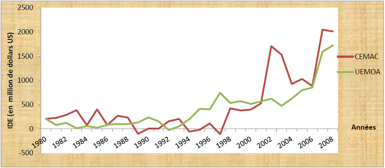 Les entrées totales des investissements directs en zone franc en Afrique subsaharienne sont globalement très volatiles eu égard aux fluctuations importantes constatées dans les deux Unions monétaires, illustrées par le graphique n°7 ci-après. Cette volatilité est plus prononcée en zone CEMAC. Ainsi, les années 1989, 1994 et 1997 sont caractéristiques d’importantes sorties d’IDE. Par contre en zone UEMOA, seule l’année 1992 a connu des désinvestissements importants. Cette configuration des mouvements d’IDE en CEMAC peut s’expliquer par le fait qu’elle enregistre des investissements essentiellement orientés vers l’exploitation des ressources naturelles. Toutefois, la crise financière de 2007 semble infléchir les entrées d’IDE dans les deux régions. En termes absolus, les flux entrants d’IDE de la dernière décennie, présagent une forte attractivité de la CEMAC. Mais, en moyenne, la zone CEMAC et l’UEMOA ont reçu respectivement un montant d’IDE de 508 et 427 millions de dollars sur la période 1980-2008.