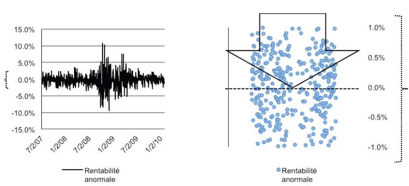 Les rentabilités anormales progressent de façon croissante jusqu’au point bas puis semblent stagner jusqu’à la fin de l’étude. Le retour vers la normalité semble loin. Les stratégies basées sur le retour à la moyenne (meanreversion-model) semblent être difficile à réaliser. Ce test montre que les anormalités ont été statistiquement multipliées par 5 au sommet de la crise. Les statistiques préliminaires nous ont informés de la non-normalité des cours étudiés. Nous en avons ici un exemple plus concret.