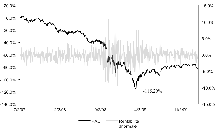 Ce test exprime l’écart-type des fluctuations des cours lié à la perturbation des rentabilités anormales. Nous avons ici un pic, partant du début de l’expérience jusqu’au 3/10/2009, lequel enregistre un taux anormalement bas cumulé de -115,20%.