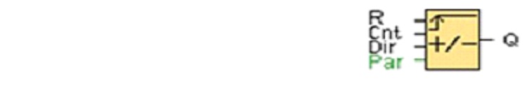 En fonction du paramétrage, une impulsion d’entrée incrémente ou décrémente par une valeur de comptage interne. La sortie est mise à 1 où 0 lorsque les valeurs de seuil paramétrées sont atteintes. Une entrée Dir permet d’inverser le sens de comptage.
