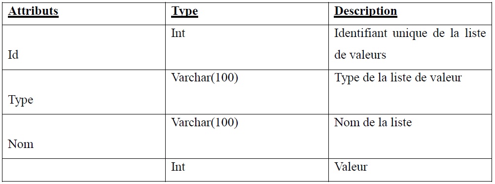 Figure III.5.2.1.6 : Description de la table « ListeDeValeurs »