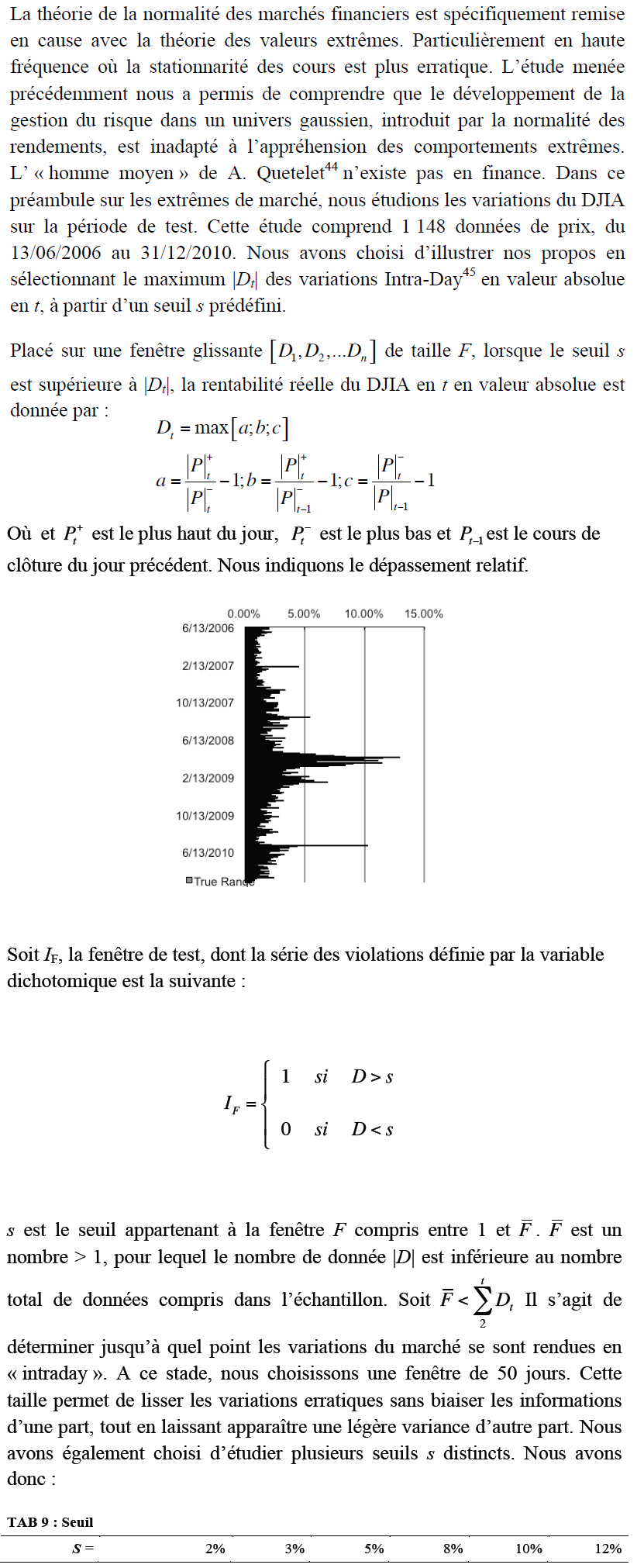 Cela représente 53.57% des données de l’étude(46). Le DJIA, pendant la crise des Subprimes, a donc connu statistiquement une distribution des cours formant des queues de distribution épaisses en valeur absolue.