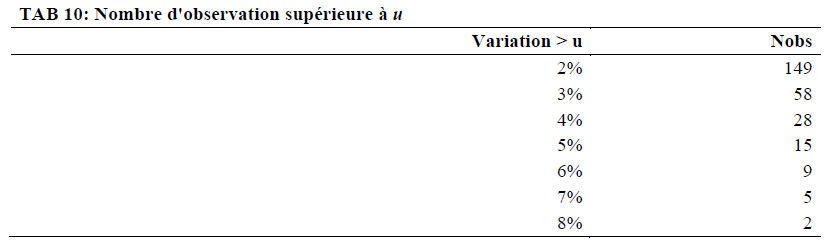 Les résultats sont évocateurs. Les variations laissent apparaître une majorité des variations journalières supérieures ou égales à 3%. Celles-ci se concentrent sur une période de 615 jours, du 17/01/2008 au 23/09/2009.