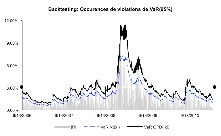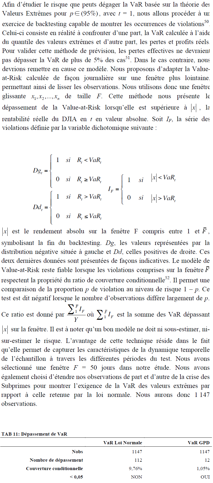 S’intéressant directement à la queue de distribution, faisant apparaître le degré d’importance statistique des extremums, nous allons dans cette section présenter, à partir des résultats obtenus précédemment, une stratégie de gestion basée sur le calcul de la Value-at-Risk. Notre étude va porter sur la rentabilité ajustée du risque que peut proposer la VaR déterminée à partir du quantile des extrêmes sur le DJIA pendant la crise des Subprimes. En proposant une telle stratégie, un investisseur pouvait-il éviter les pertes liées à cette crise ? Pouvait-il bénéficier d’un Tracking-Error avantageux en achetant lorsque la VaRt > Rt et en vendant lorsque la VaRt < Rt au seuil de probabilité fixé ? Nous allons mettre en avant deux mesures liées à la VaR : dans un premier temps, nous sélectionnerons un modèle adéquate quant à la validité du modèle présenté, puis dans un second temps, nous calculerons, à partir des résultats obtenus, la performance que pouvait développer une stratégie long-short du 13/06/2006 au 31/12/2010.