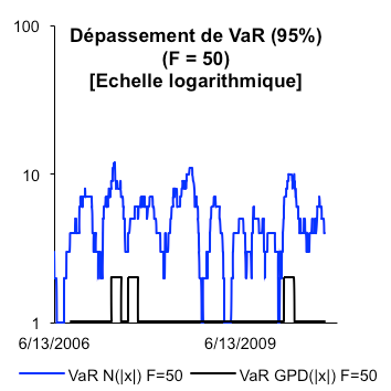 En période de crise, la VaR GPD ne laisse apparaître qu’une infinité de dépassements journaliers sur F = 50. Le ratio de couverture conditionnelle nous indique qu’il existe un taux de dépassement de 1,05% pour une Value-at-Risk acceptant 5% de risque. Ce modèle rempli donc les conditions pour un dépassement qui ne sous-estime, ni ne surestime le risque de marché. Ce modèle conditionnel fournit une quantification plus flexible de la VaR, qui tient compte de la dynamique de la volatilité. En effet, lorsque le taux de croissance dépasse le seuil u fixé à 3%, la VaR conditionnelle « vibre », couvrant le risque de perte extrême. Le graphique ci-dessous souligne la différence qu’il peut exister entre la VaR classique et celle liée aux valeurs extrêmes.