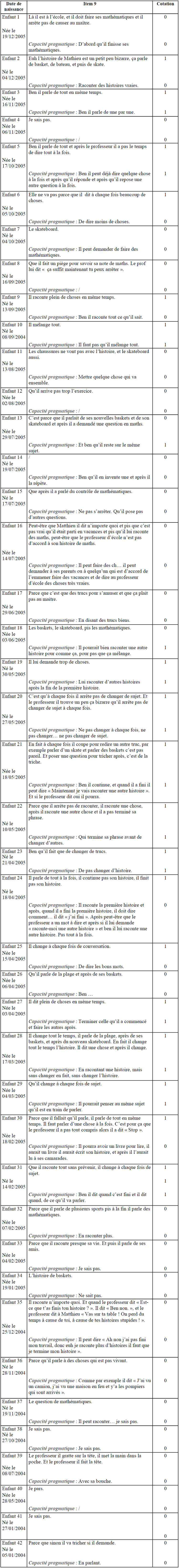 Cet item est difficile à coter car les exemples de cotation sont ambigus. La barrière entre les notations 0 et 1 était parfois difficile à définir. Certaines réponses n’explicitaient pas le tour de parole mais les expressions utilisées par les enfants permettaient de voir que c’est ce qu’ils voulaient exprimer. Exemple : « Pourquoi tu nous as appelées alors que tu voyais bien qu’on était en plein dans une discussion sérieuse ? » (Coté 1). Nous ne sommes donc pas sûres de certaines cotations.