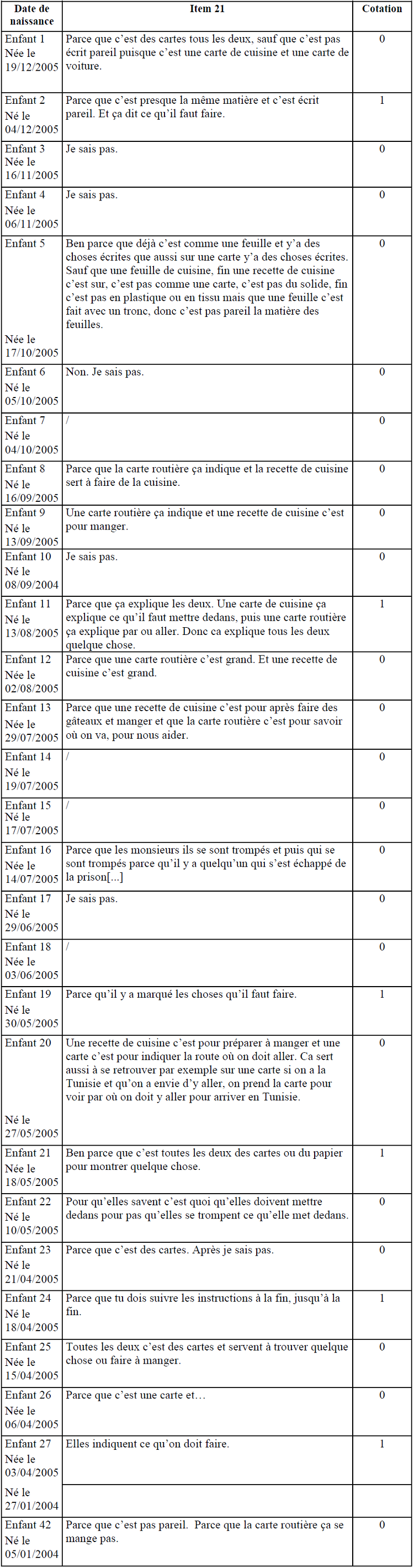 Peu d’enfants ont réussi à trouver les liens existants entre ces deux objets (cf. item 18), ce qui montre que le raisonnement analogique n’est sûrement pas encore acquis à cet âge.