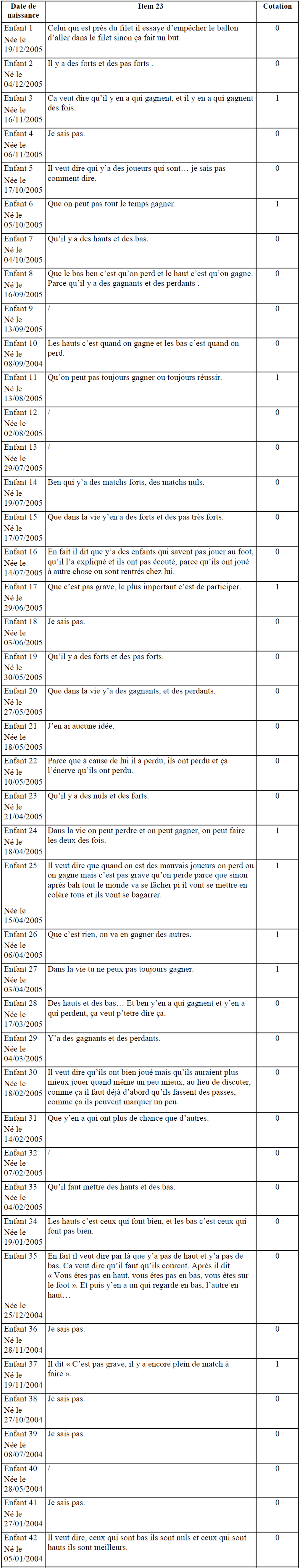 Cet item évalue la compréhension du langage non littéral. Les enfants doivent ici expliquer un proverbe. Ce qui est surprenant est que presque la totalité des enfants répondent que « Dans la vie, il y a des hauts et des bas » signifie qu’il y a des bons (en haut) et des moins bons (en bas) : ils en ont la même interprétation.