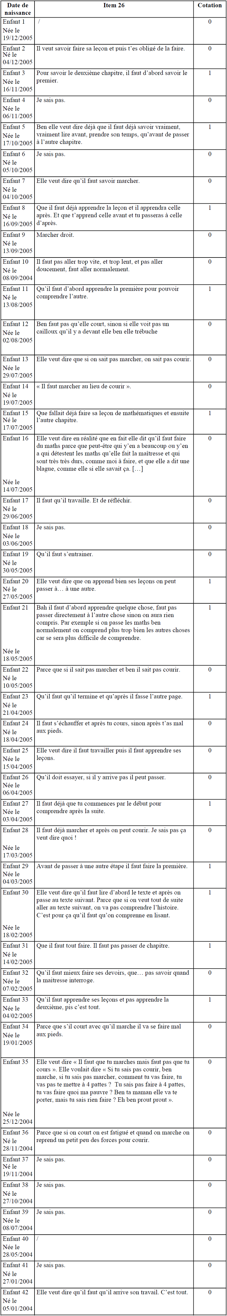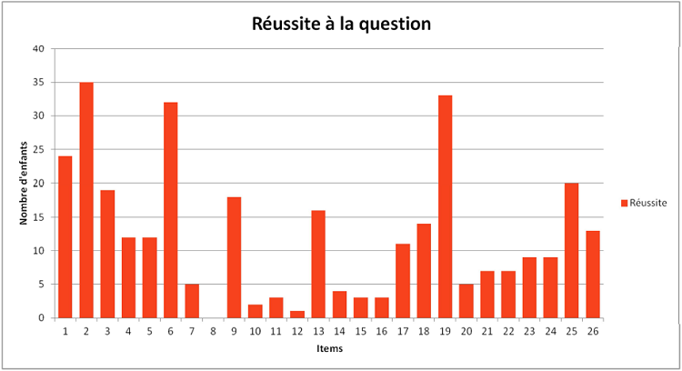 Dans le tableau 2, nous pouvons apercevoir que les résultats sont très inégaux entre les différents items. Malgré le fait que la difficulté des items est censée croître, on observe que la réussite et l’échec sont variables tout au long des 26 items. Par exemple, aucun des enfants n’a répondu correctement à l’item 8, tandis que 33 enfants ont réussi à la première question de l’item 19.