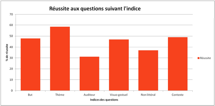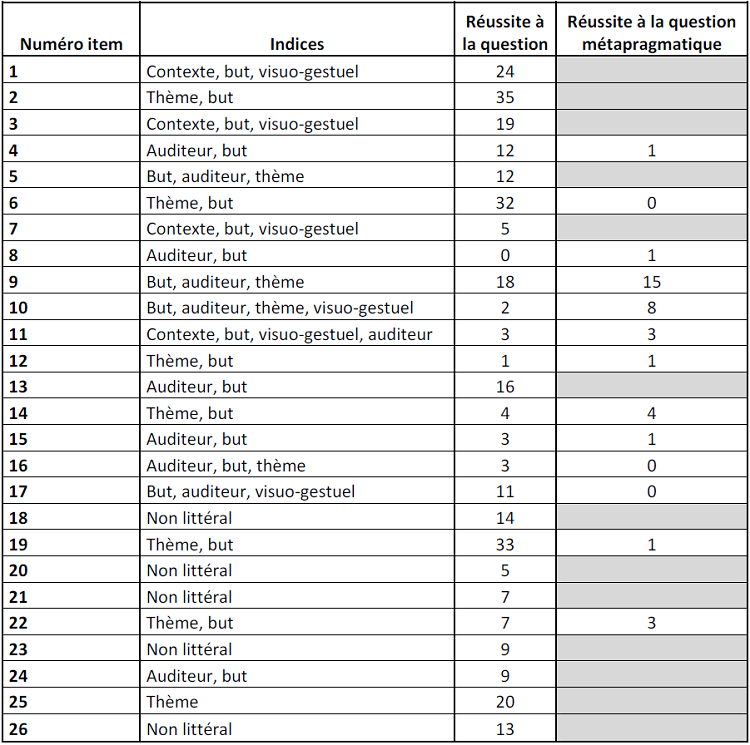 Dans le tableau 4, nous pouvons observer que le pourcentage de réussite est plus élevé lorsque l’indice thème est présent dans l’item (58% de réussite). C’est donc cet indice qui est le plus facile à interpréter pour les enfants, tandis qu’ils perçoivent moins facilement les indices concernant l’auditeur.