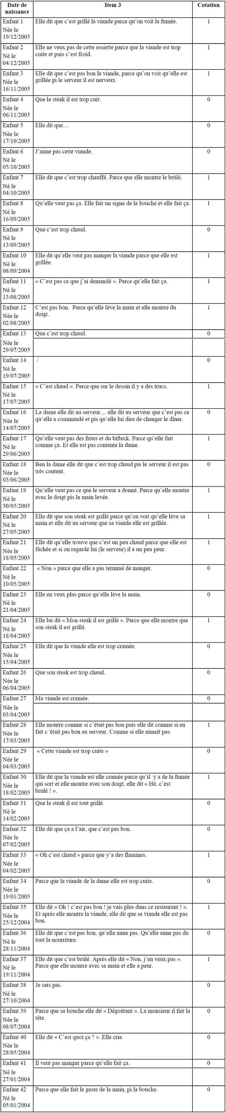 Comme pour l’item 1, nous pensons que les enfants auraient obtenu de meilleurs résultats si la question « Comment le sais-tu ? » avait été posée séparément de la première question, où l’on demande ce que la dame dit au serveur.