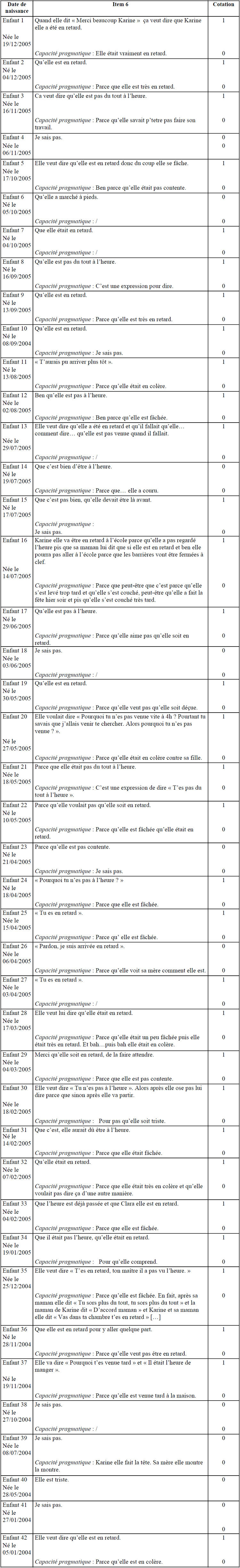 Hormis les enfants qui ne répondent pas à la question, il n’y a que quelques enfants qui n’ont pas compris le langage indirect de la mère qui dit à Clara « Merci beaucoup d’être à l’heure ! » alors qu’elle est en retard. Ils ont par exemple compris que c’était bien d’être à l’heure.