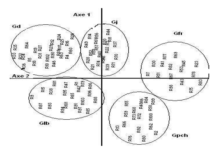 FIGURE 7 : REPARTITION DES RELEVES DANS LES PLANS FACTORIELS DES AXES 1 ET 2