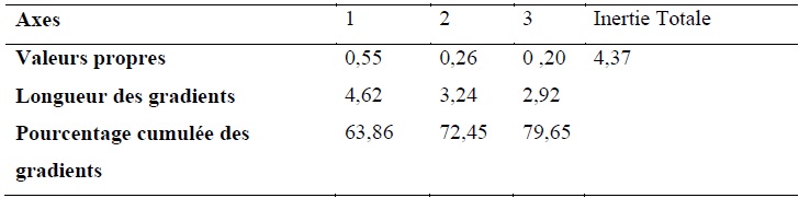Tableau V : Valeurs propres et pourcentages de variance expliquée par les trois premiers